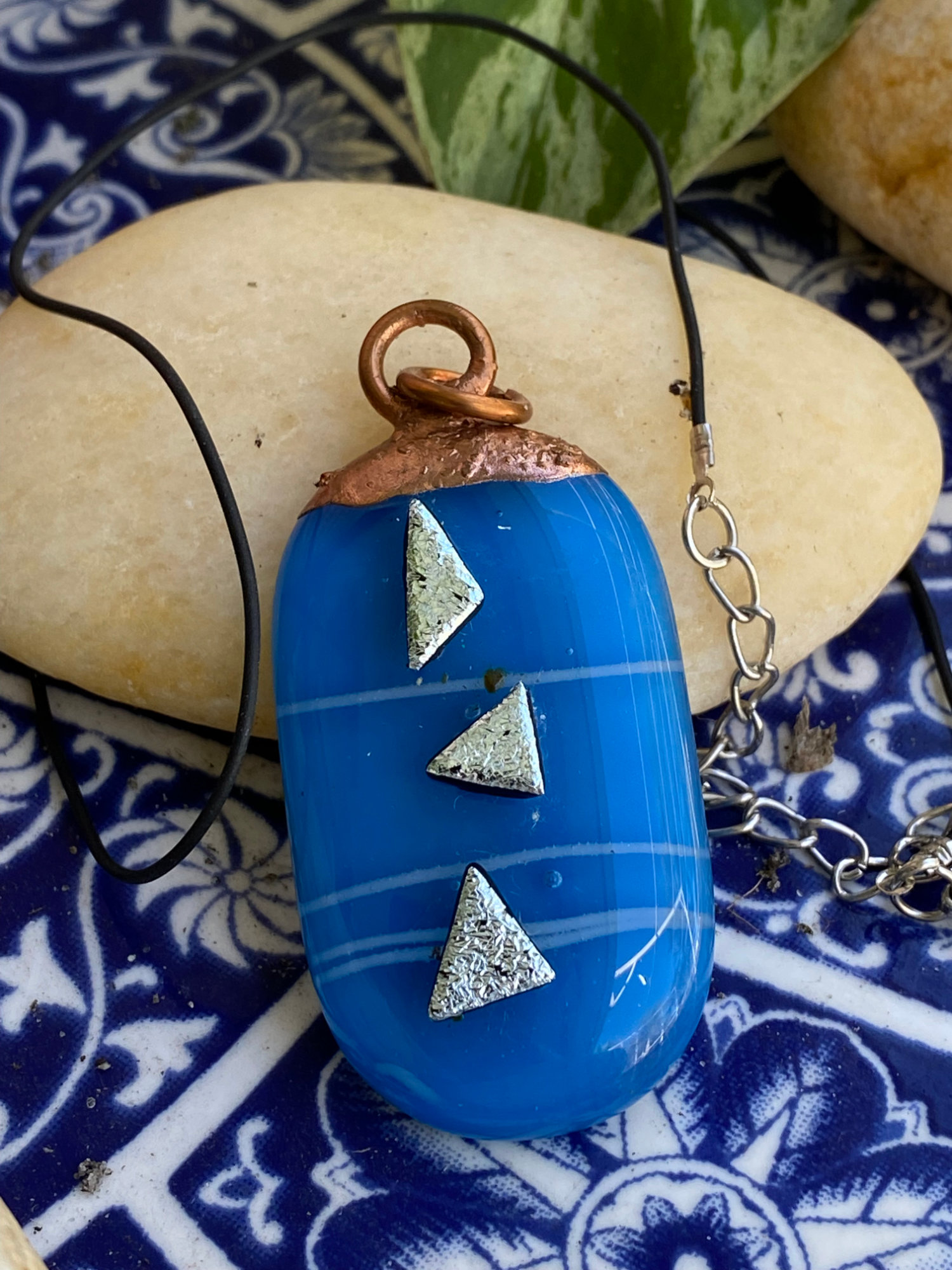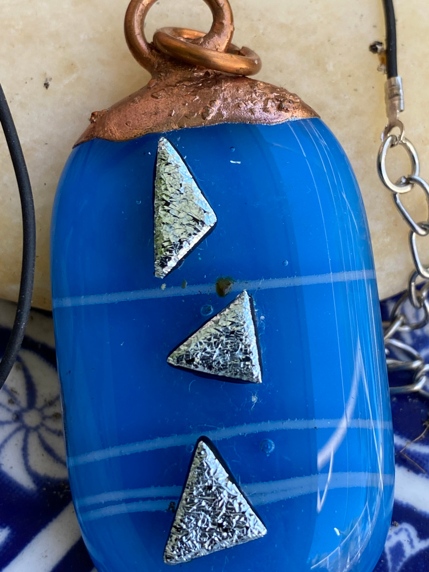 Electroformed Copper Fused Glass Pendant Blue With Silver Dichroic Glass Accents