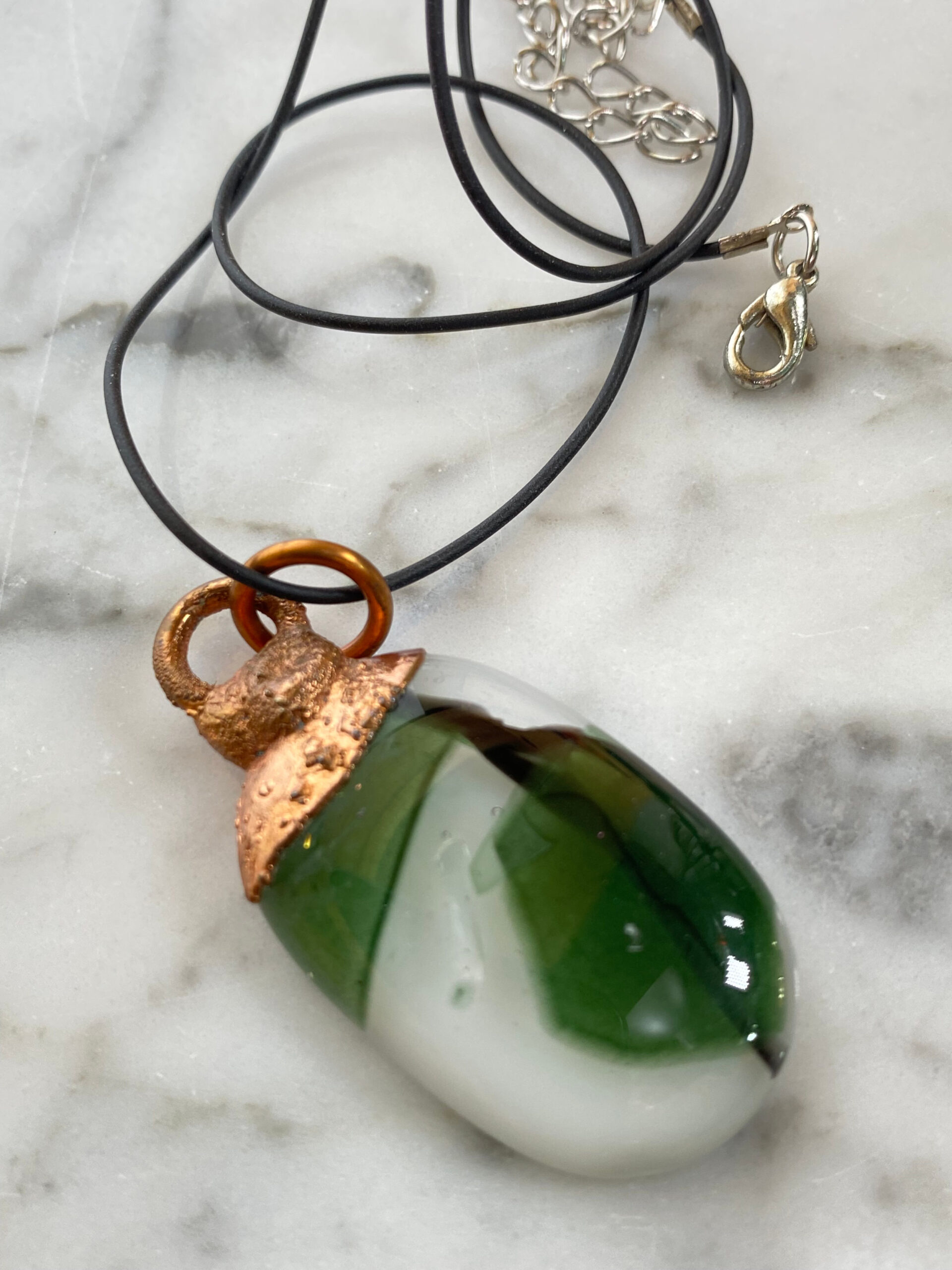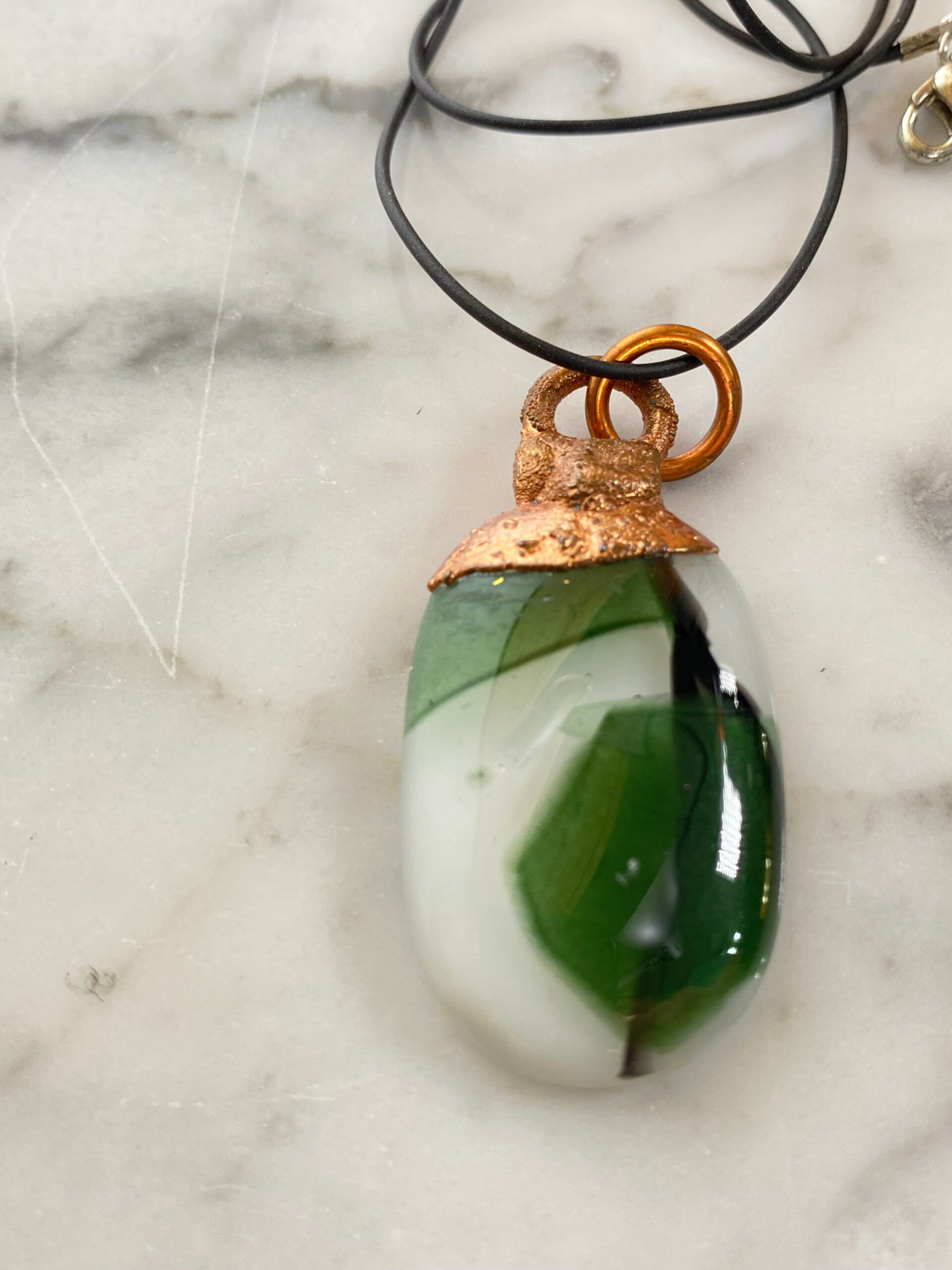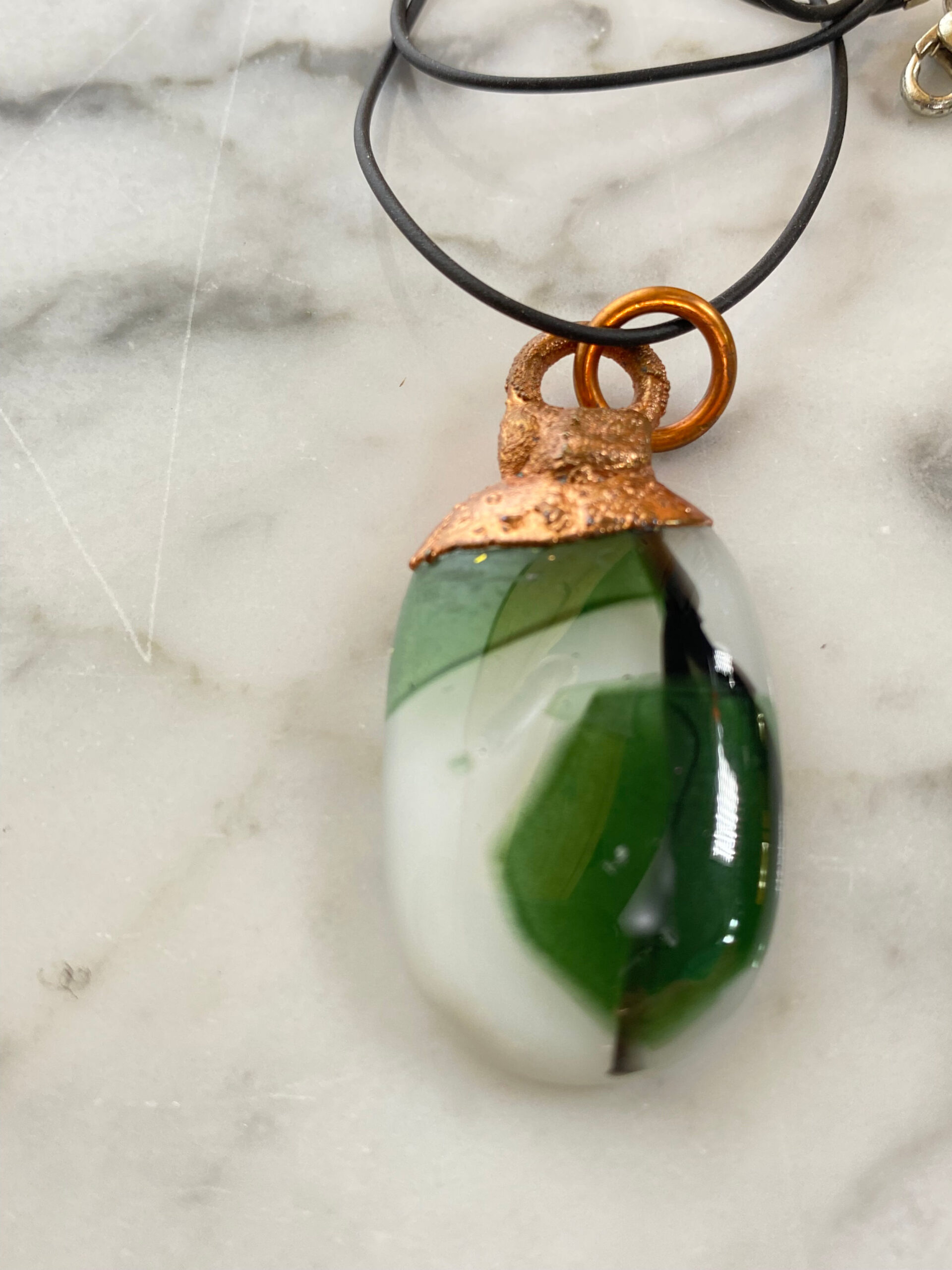 Be the first to review “Electroformed Copper Pendant White With Green Accents Fused Glass”
