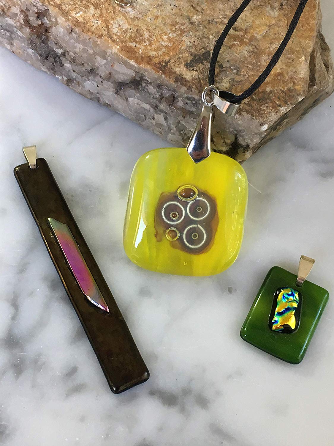 Fused Glass Pendant Necklace in Yellow, Green, and Black with Dichroic Fused Glass Accents Handmade Great for a Birthday Gift, Wedding Gift, Anniversary Gift, or a Special Occasion.
