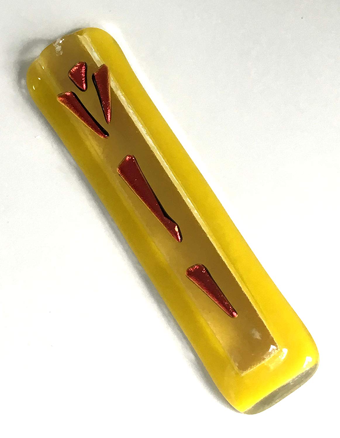 Fused Glass Mezuzah Case Designer Handmade Yellow with Red Dichroic Glass Accents Red Shin Great for Jewish Housewarming Gifts and Wedding Gifts, Anniversary Gift or Bar/Bat Mitzvah Gift.